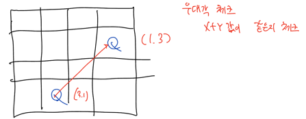 - 다음으로는 대각선에 대한 체크가 필요하다. 먼저 오른쪽 위로 올라가는 우대각 체크는 각 좌표의 x와 y값을 더한 값이 같은지 확인하면 된다.