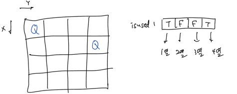 - n이 주어졌을 때, 퀸이 서로를 공격하지 않도록 체크하려면