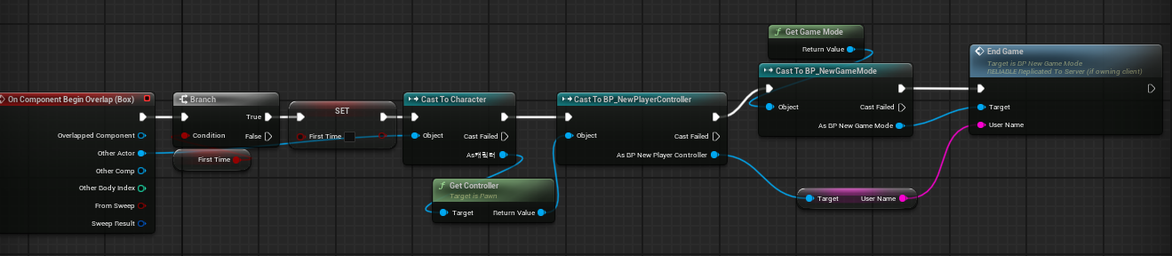 - PlayerController의 EndGame 이벤트는 위젯을 create하고 Widget의 EndGame 이벤트("replicate 되어 있지 않음")를 call한 후, widget을 add to viewport 해준다.