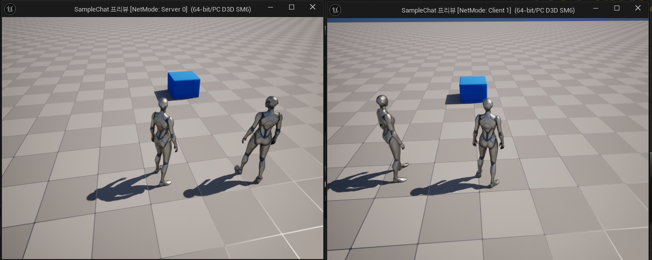위에 처럼 구성한 후 플레이 방식을 리슨 서버로 바꾸고 실행하면 아래와 같은 모습을 볼 수 있다.