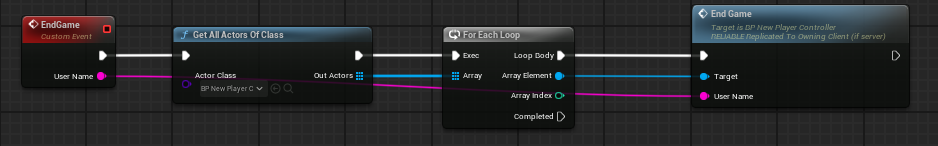 - GameMode의 EndGame 이벤트 ("replicate 되어있지 않음") 는 모든 PlayerController를 돌면서 각 PlayerController의 EndGame 이벤트(PlayerController의 이벤트, "소유중인 클라에서 실행")를 call한다.