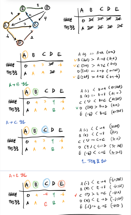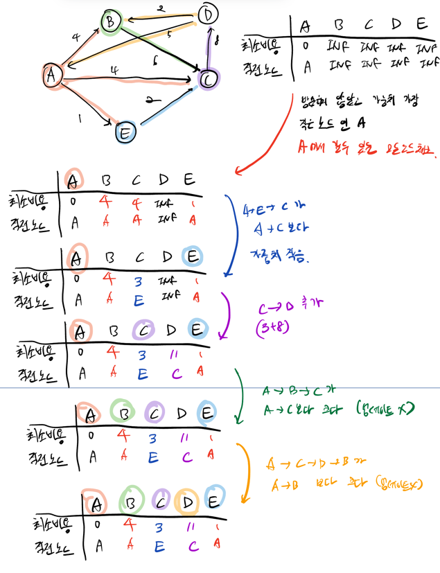 - 이후 최소비용이 가장 낮은 E노드를 시작으로 더 작은 최소비용이 되는 경로가 있다면 갱신 A->E->C가 기존의 A->C 보다 최소비용이 작으므로 갱신! (E 방문)