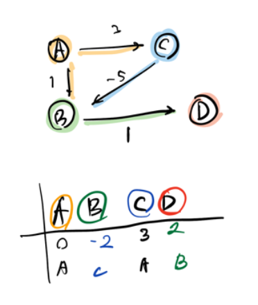- D까지의 경로의 최소 비용은 A->C->B->D 이므로 -1인데