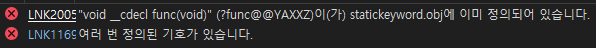 만약 위의 statickeyword.cpp에서 s_Variable 변수의 static 을 빼면 아래와 같이 이미 정의되어있다는 오류를 출력한다.