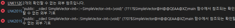 과제를 하던 도중, 템플릿을 사용하여 vector 클래스를 만들고 있는데 .h 파일에서 정의를 하고 .cpp에서 구현을 하였더니 컴파일러가 링크 에러를 띄워주었다. (LNK1120)