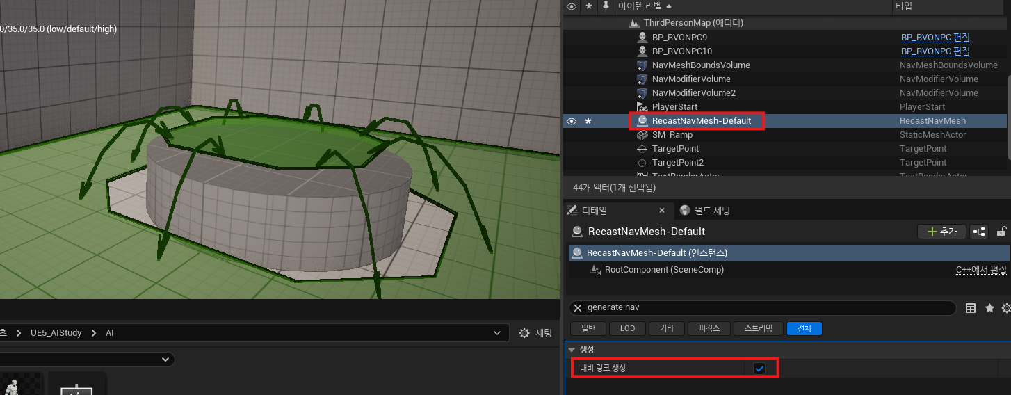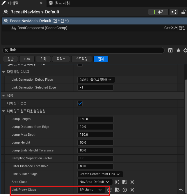 - 레벨에 존재하는 RecastNavMesh에 Generate Nav Links 를 true로 체크