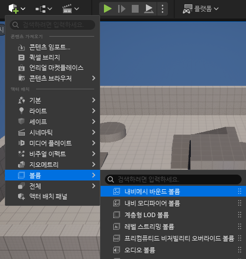 - 액터 배치 -> 볼륨 -> 내비메시 바운드 볼륨
