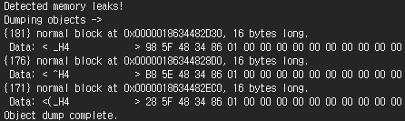 - unique_ptr로 만들지 않고 delete를 하지 않은 상태로 메모리 누수 체크를 해보면 아래와 같이 메모리 누수가 발견되는 것을 볼 수 있다.