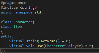 - Character 클래스가 있는 Character.h에서 #include "Item.h"를 하면 순환 참조 문제가 생긴다.