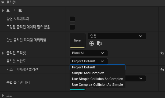 - static mesh를 켜고, 디테일 창에 아래와 같이 콜리전 복잡도를 설정하는 부분이 존재한다.