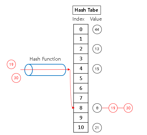충돌이 발생한 경우, 링크드 리스트를 통해 같은 해시값을 가지는 데이터를 뒤에 이어서 저장하는 방식이다.